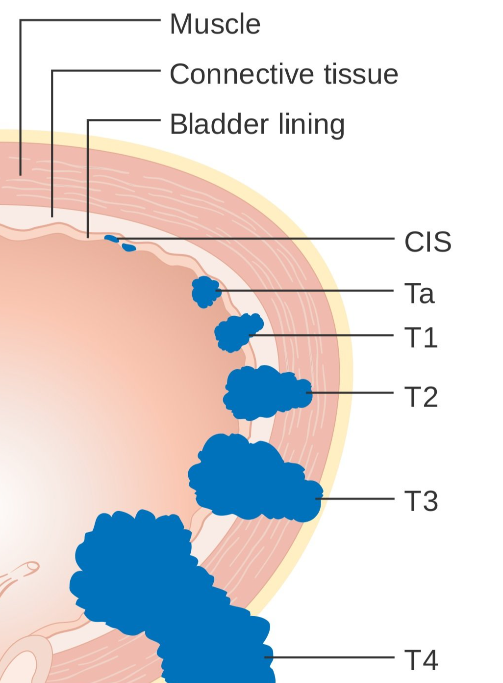 Bladder cancer comes in two basic “flavors” known as the GRADE - low grade and high grade. Low grade bladder cancer is very unlikely to spread and is almost always curable. High grade bladder cancer has a higher potential to spread and sometimes necessitate removal of the bladder. Bladder cancer STAGE refers to how deeply the cancer is growing into the wall of the bladder- similar to a plant growing roots into the soil.