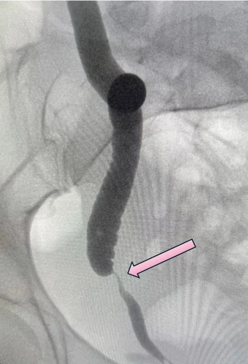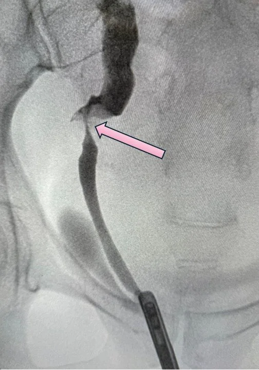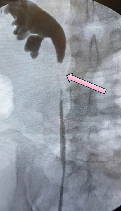 A patient was referred to me after a kidney stone procedure with another urologist. There was a complication leading to a very long stricture of the middle ureter (15 centimeters). The x-ray on the right shows the ureter above the stricture (purple), then no visualization of the middle ureter (yellow bracket), and then the bottom part of the ureter below the stricture is seen. In this case, I performed a very complex robotic reconstruction that involved using part of the small intestine - the ileum - and successfully fixed the problem. In other cases, we use a skin graft - taken from the inner surface of the cheek. This is called a buccal graft.